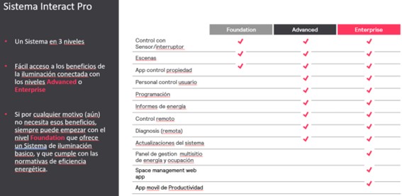 • Advance: incluye una pasarela que conecta las luminarias a Internet y permite generar horarios, ver informes de consumo y que los usuarios se conecten a la instalación para regular según sus necesidades.