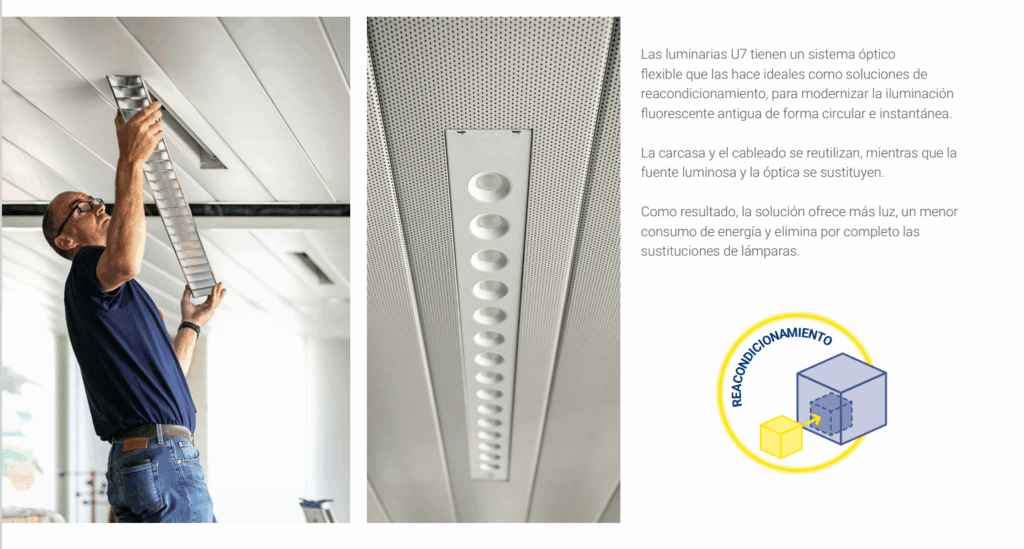 Estas soluciones permiten un montaje a presión y reparaciones in situ utilizando herramientas básicas, sin necesidad de realizar modificaciones en el techo ni cambios estructurales. Además, promueven la reducción del uso de materiales al reutilizar carcasas y cableado existentes. El diseño optimizado permite incorporar menos materiales nuevos, lo cual contribuye significativamente a disminuir la huella de carbono desde el origen.