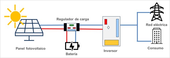 • Regulador/Controlador de carga: Controla el funcionamiento de las baterías e indica cuando deben cargarse o descargarse, evitando que puedan sufrir daños.